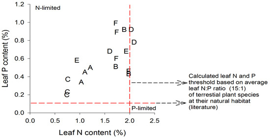Comparison of the leaf N and leaf P contents of the dominant tree species with the threshold of leaf N and leaf P content calculated based on the suggested leaf N:P ratios by Koerselman and Meuleman (1996) and Aerts and Chapin (1999). Bold letters represent the tree species: (A) Alstonia macrophylla, (B) Buchanania arborescens, (C) Syzygium sp., (D) Casuarina equisetifolia, (E) Acacia mangium, and (F) Terminalia catappa.