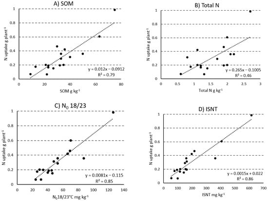 Linear relationship between total N uptake by maize (Zea mays L.) and soil organic matter (A), soil total N (B), potentially available N estimated by aerobic incubation at 18/23 °C (C), and the Illinois Soil Nitrogen Test (D).