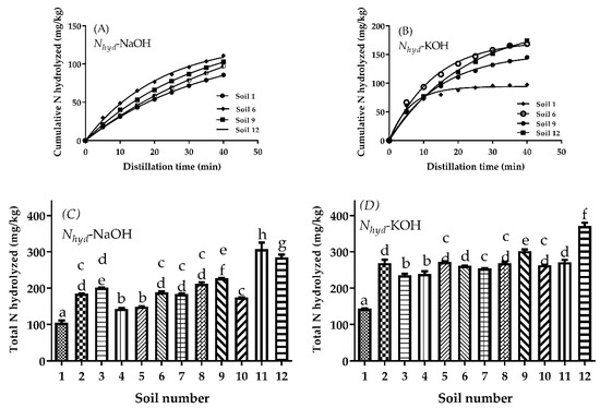 The cumulative amounts and patterns of alkaline hydrolysis of N with time of distillation in four of the soils used are shown in Figure 2a,b for KOH and NaOH, respectively; the results for the other soils fall within those shown. In general, the cumulative amounts of N hydrolyzed with time increased in a somewhat linear fashion during the first 15 min of distillation with the rate of N hydrolysis decreasing slowly as distillation progressed (Figure 2a,b). The total amounts of N hydrolyzed in the soils during the 40 min of distillation by the two reagents varied among the soils studied (Figure 2c,d), with the amounts ranging from 104.6–306.9 mg kg−1 and 143.5–371.3 mg kg−1 for NaOH and KOH, respectively. For each reagent, the amount of N hydrolyzed was significantly (p < 0.05) different among the soils (Figure 2c,d). Statistical analysis showed that the amount of N hydrolyzed with KOH was significantly (p < 0.05) higher than that with NaOH (Figure 2c,d). The total amounts of N hydrolyzed, expressed as a percentage of the ON contents of the soils, ranged between 3.9 to 15.1% for NaOH and between 4.6 and 15.9% for KOH.