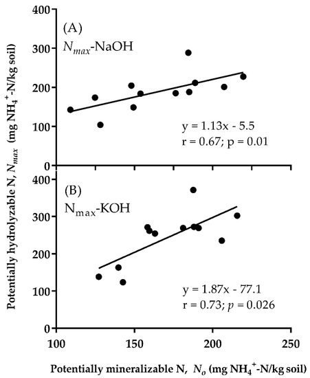 Although our study lacks information on the chemical nature of ON hydrolyzable by NaOH and KOH, it is generally known that the chemical hydrolysis of ON in soils is selective with regards to the bond being hydrolyzed. Gianello and Bremner [6] reported that only six out of the over 50 ON compounds known to occur in soils or soil hydrolysates released NH4+-N in hot KCl. In the present study, we speculate that the NaOH and KOH hydrolyzable N are derived from exchangeable NH4+, hexosamines in amino sugars, α-amino and amide-N (glutamine, asparagine, glucosamine, and galactosamine), and hydrolyzable unidentified N fractions [37,38,39]. These amine and amide bonds hydrolyzed by the alkaline reagents could be the same ones that were mineralized by the biological methods. This assertion is consistent with the results of Dodor and Tabatabai [40] who reported significant relationships between the estimated Nmax values and the activities of arylamidase and amidohydrolases, especially amidase, and suggested that the alkaline reagents might be hydrolyzing mainly amide-N. The stronger relationship between Nmax-KOH and No may be attributed to KOH probably hydrolyzing more of the same ON pool as the biological methods, some of which may have originated from the compounds released from microbial cells.