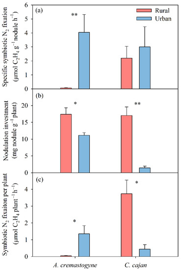Indices of symbiotic N2 fixation at the rural and urban sites: (a) specific rate of symbiotic N2 fixation, (b) nodulation investment, and (c) symbiotic N2 fixation for per plant (PNF). Bars represent mean values with standard errors (n = 5). * and ** denote significant difference at p < 0.05 and p < 0.01 between the rural and urban sites, respectively.