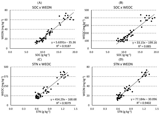 Almost all correlations were significant, and the correlation coefficients are presented in Table 8. The WEOC and WEON very strongly correlated with SOC, 0.94 * and 0.95 *, respectively; and with STN, 0.96 * and 0.97 *, respectively (Figure 1A–D, and Table 8). The correlation between STN and soil N fractions was very strong (r > 0.80), except for with HA-N and HU-N (0.67 * and 0.59 *, respectively) (Figure 2A,D and Table 8). WEOC and WEON behaved similarly, being strongly correlated with most of the N fractions, DSD-N and KCl-N (Figure 3A–D, and Table 8). The measurements, DSD-N and KCl-N, produced similar results in most of the correlations studied (Table 8). However, KCl-N had slightly stronger correlations with HA-N and AI-N than DSD-N.
