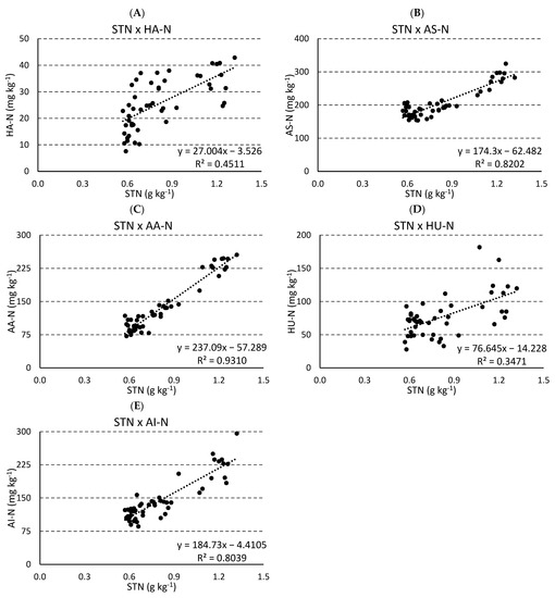 Differences between the results of potentially available N evaluated by the DSD-N and KCl-N methods were observed, as these methods extract different fractions of organic N. Whereas DSD-N extracts part of the AS-N, KCl-N extracts mineral N and part of the HA-N and AS-N [29,37]. This is shown in Table 8, where the correlation coefficient between KCl-N and HA-N is slightly higher than that with DSD-N. The AS-N fraction decomposes in strong alkali conditions and can be efficiently extracted by NaOH solutions. This fraction is known as one of the main substrates of N mineralization, and its contents strongly correlate with the potentially mineralizable N (N0) obtained in laboratory incubations and the N uptake by plants [2,12,14,38]. These characteristics make the DSD-N method more suitable for evaluating the potentially available N, having previously demonstrated strong correlations with N absorbed by plants [2,38].