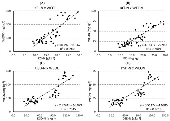 Linear relationship between potentially available nitrogen extracted with hot KCl solution and direct steam distillation and water extractable carbon and nitrogen; hot KCl and water extractable organic carbon (A); hot KCl and water extractable organic nitrogen (B); direct steam distillation and water extractable organic carbon (C); and direct steam distillation and water extractable organic nitrogen (D). Equations and coefficients of determination are displayed in each graph.