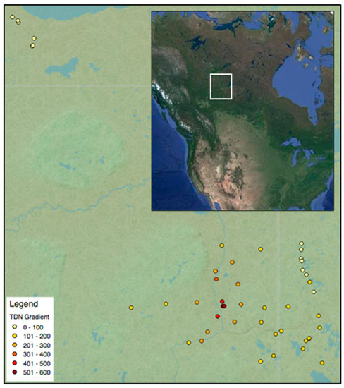 In general, transportation, industry, and agriculture are the dominant sources of N emissions, and regions not immediately surrounding a point source may also be subjected to chronic N deposition owing to long-range atmospheric transport [12]. In Canada, more than 60% of all national nitrogen oxide (NOx) emissions originated from Alberta, Saskatchewan, and British Columbia in 2017. Furthermore, Alberta and Saskatchewan were responsible for 49% of all national ammonia (NH3) emissions [13]. Large-scale, open-face mining of bitumen in the Athabasca Oil Sands Region (AOSR) of Alberta represents a significant point source of N emissions [14]. As such, there is growing concern that the AOSR may be impacted by chronic N deposition [15].