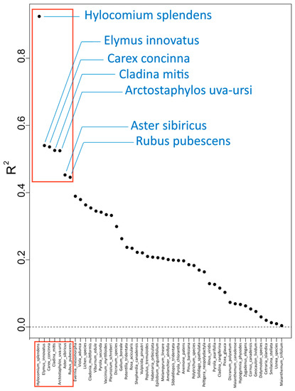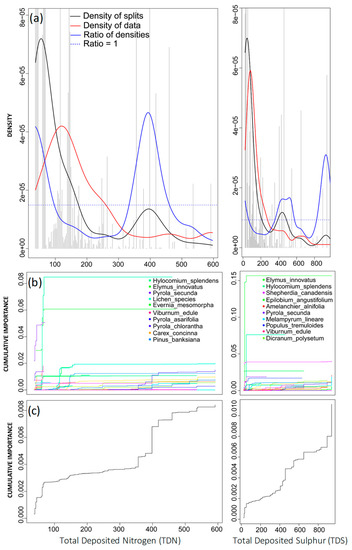 Community thresholds can also be observed in the cumulative importance plots (Figure 6b,c). Shifts in vascular species were predominantly associated with greater levels of TDN (Figure 6b). At low levels of TDN (less than 100 eq ha−1 yr−1), Hylocomium splendens, a bryophyte, experienced the greatest cumulative importance change (Figure 6b), and respective specific R2S performance values revealed that TDN best explained the variation within this species (Table 3). A small number of lichen species, including Evernia mesomorpha, experienced a sudden rise in specific cumulative importance between 100–200 eq ha−1 yr−1, although, given the decline in the density of data and that the ratio of densities remained less than 1 (Figure 6a), there was no effect on the overall community. From both the density plot and the cumulative importance plots, it appeared that the secondary breakpoint, at 400 eq ha−1 yr−1, was representative of a more clearly defined community-level threshold for nitrogen deposition.
