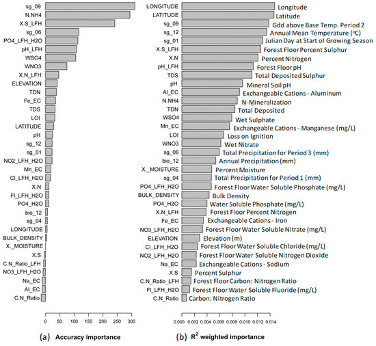 Modelled nitrogen and sulphur deposition data (in eq ha−1 yr−1) were obtained from Global Environmental Multi-Scale Modelling Air Quality and Chemistry (GEM-MACH [36]). Data were obtained at a resolution of 2.5 km × 2.5 km. Modelled deposition scenarios were based on emissions inventories from 2006 and 2010, with 2010 data focused on the Athabasca Oil Sands. Nitrogen deposition data included 11 different species, while S deposition data included four different species (Supplementary Materials SIII). Total N and total S deposition were also included [36]. In addition to deposition data (n = 17), elevation, longitude, latitude, and 24 bioclimatic variables were also included in the analysis (Supplementary Materials SIII).