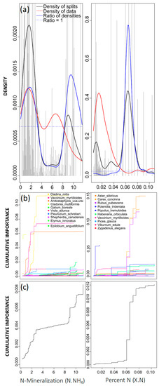 Gradient forest analysis for nitrogen (N)-mineralization (N.NH4; left column) and percent nitrogen (X.N; right column). (a) Densities plotted with binned split importance values (grey histogram bars), the density of data (red line), the density of splits (black line), and the ratio of split-over-density (blue line). The dashed line is where the ratio = 1. Relatively greater community-level changes (high split importance values) occur when the ratio of densities > 1. (b) Species cumulative importance plots showing the cumulative distribution of splits importance scaled by R2 weighted importance and standardised by the density of observations. Each line represents an individual species, and the legend identifies the top 10 species experiencing the largest composition changes across the gradient. (c) Community cumulative importance plots are calculated by the sum of the weighted averages of all species in (b) and show the overall pattern of compositional change for all species.