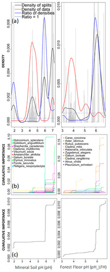 Other soil chemical variables were returned with high R2-weighted importance, with both mineral soil and forest floor (LFH) pH identified as contributing to significant changes in community composition (Figure 5a). The density plot for mineral soil pH revealed two community breakpoints where the ratio of densities was greater than 1 (Figure 5). The first breakpoint, occurring around a pH of 2, was less pronounced than the second breakpoint, occurring around a pH of 6 (Figure 5). The density of data and binned split importance values (grey histogram bars) peaked between pH 3 and 5. Although a low pH can indicate soil acidification [54], the associated density of splits in this range was very low. This indicates that any compositional changes occurring in this range did not result in a significant community shift (Figure 5).