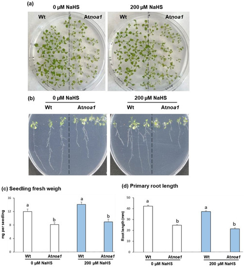 Figure 1 shows the appearance of Arabidopsis Wt and Atnoa1 seedlings grown in the absence and the presence of 200 µM NaHS (Figure 1a,b), as well as the analysis of their biomass (Figure 1c) and primary root length (Figure 1d) after 16 days. A visual examination allows observing that the green cotyledons of the Atnoa1 seedlings had smaller size and a yellowish color in comparison to Wt seedlings. This aspect should be associated with the NO deficiency in this mutant, which is likely related to cotyledon organogenesis and chloroplast formation. A similar situation occurred in previous assays with these mutants and the cyclic GTPase family, where smaller yellowish and pale green leaves were observed [34,35]. On the other hand, through comparing the color of the leaves from the mutant seedlings treated with H2S (Atnoa1 plus NaHS) with the control mutant seedlings, it is observed that the treated plantlets are greener than the untreated ones. Therefore, it is suggested that the treated seedlings have a lower loss of green color, similar to what occurs in pak choi plants (Brassica rapa subsp. chinensis) fumigated with H2S [36].