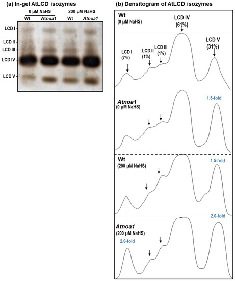 Figure 2b depicts the total relative activity quantification considering all the LCD isozymes present in the Wt seedling (control). Thus, AtLCD IV represented 61% of the total activity, followed by AtLCD V with 31%, and AtLCD I with 7%, whereas AtLCD II and AtLCD III represented less than 1% each. Among the different isozymes, AtLCD V is the isozyme that underwent the greatest change in comparison to the Wt seedlings not supplemented with NaHS (control). Thus, it is observed that the Atnoa1 mutant increases 1.5-fold, and in seedlings supplemented with 200 µM NaHS, the increase in Wt is also 1.5-fold while in Atnoa1 it is 2-fold. On the other hand, the AtLCD I in Atnoa1 seedlings grown in a medium with 200 NaHS increases 3-fold in comparison to the control Wt seedlings grown without NaHS and 2-fold to the Wt seedlings supplemented with 200 µM NaHS.