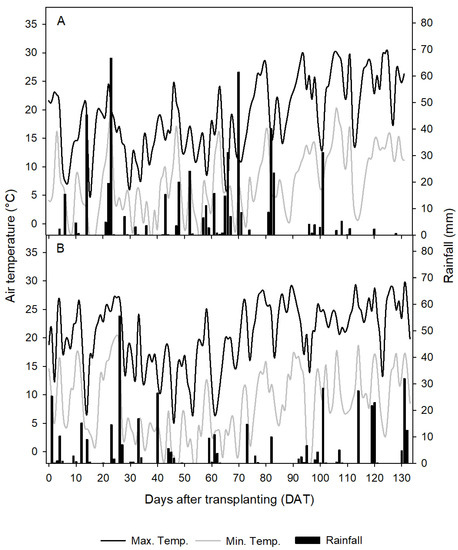 Daily maximum (max.) and minimum (min.) air temperatures (°C) and rainfall (mm) for onion (Allium cepa L.) grown during 2021 (A) and 2022 (B) in Georgia, USA. Data averages estimated using the University of Georgia Weather Network.