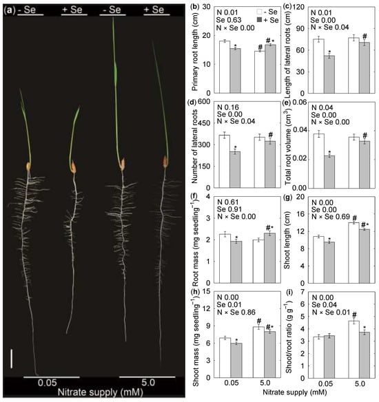 Effects of Se and nitrate treatments, singly and in combination, on growth of rice seedlings. (a) Phenotype of rice plants grown for 7 days under Se and nitrate treatments. The scale bar represents 2 cm. (b) Primary root length. (c) Total length of lateral roots. (d) Number of lateral roots. (e) Total root volume. (f) Root biomass. (g) Shoot length. (h) Shoot biomass. (i) Shoot/root ratio. Whitin each panel, the analysis of variance for the effect of nitrate (N) and selenium (Se) is shown along with the p-value, where a p-value smaller than 0.05 represents that the factor or both factors (N × Se) affects the outcome. Asterisks (*), when shown, indicate statistically different means between untreated and Se-treated plants within the same nitrate conditions (p < 0.05). Hashtags (#), when shown, indicate statistically different means between plants grown under 0.05 mM nitrate and 5 mM nitrate within the same Se treatment (p < 0.05). Data are mean ± standard error of three separate experiments, with five replicates of 10 seedlings each.