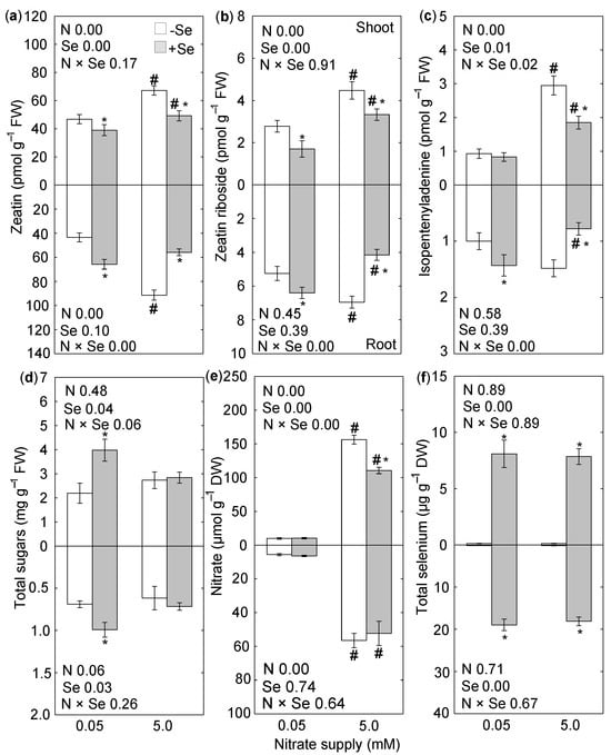Effects of Se and nitrate treatments, singly and in combination, on concentrations of cytokinin, sugars, nitrate, and selenium in shoot and root of rice seedlings. (a) Zeatin. (b) Zeatin riboside. (c) N6-(Δ2-isopentenyl) adenine. (d) Total sugars. (e) Nitrate. (f) Total selenium. Whitin each panel, the analysis of variance for the effect of nitrate (N) and selenium (Se) is shown along with the p-value, where a p-value smaller than 0.05 represents that the factor or both factors (N × Se) affects the outcome. Asterisks (*), when shown, indicate statistically different means between untreated and Se-treated plants within the same nitrate conditions (p < 0.05). Hashtags (#), when shown, indicate statistically different means between plants grown under 0.05 mM nitrate and 5 mM nitrate within the same Se treatment (p < 0.05). Data are mean ± standard error of three separate experiments, with five replicates each.