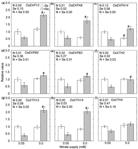 Effects of Se and nitrate treatments, singly and in combination, on expression of cell expansion-related genes in roots of rice seedlings. (a–i) Relative expression levels of OsEXP13, OsEXPA8, OsEXPA14, OsEXPB2, OsEXPB3, OsXTH2, OsXTH13, OsXTH15, and OsXTH4, in root. Whitin each panel, the analysis of variance for the effect of nitrate (N) and selenium (Se) is shown along with the p-value, where a p-value smaller than 0.05 represents that the factor or both factors (N × Se) affects the outcome. Asterisks (*), when shown, indicate statistically different means between untreated and Se-treated plants within the same nitrate conditions (p < 0.05). Hashtags (#), when shown, indicate statistically different means between plants grown under 0.05 mM nitrate and 5 mM nitrate within the same Se treatment (p < 0.05). Data are mean ± standard error of three separate experiments, with three replicates each.