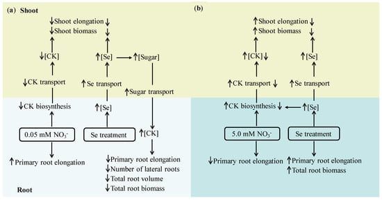 The availability of Se modifies root system architecture in rice seedlings, which is associated with the enhanced primary root elongation, and decreased lateral roots []. Root system architecture is also regulated by other minerals, including nitrogen, which has a positive effect in both cytokinin biosynthesis and signaling []. The results of the present study showed that Se supply to seedlings treated with low nitrate increased the cytokinin concentrations in the roots, and photosynthesis-derived sugars were responsible for the induction, a result that was associated with phenotypic changes in the root system. Moreover, Se application to seedlings treated with high nitrate resulted in an antagonistic role of Se and nitrate in regulating cytokinin biosynthesis, which impacted shoot growth and root system architecture of rice seedlings.