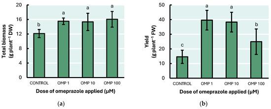 Effect of foliar OMP dose applied to green bean plants cv. Strike on total biomass accumulation (a) and pod yield (b). Different letters for each graphic indicate significant statistical differences according to the LSD Fisher test (p ≤ 0.05).