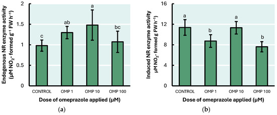 Effect of foliar OMP applied to green bean plants cv. Strike on (a) endogenous NR enzyme activity and (b) induced with NO3− nitrate reductase activity. Different letters for each graphic indicate significant statistical differences according to the LSD Fisher test (p ≤ 0.05).