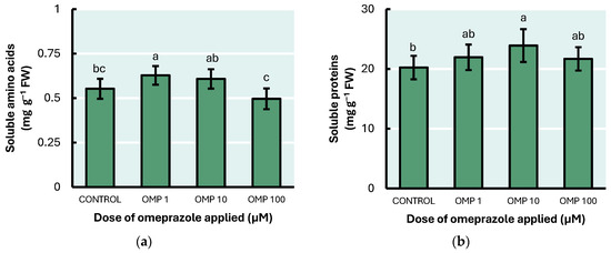 Effect of foliar OMP dose applied to green bean plants cv. Strike on the concentration of (a) soluble amino acids and (b) soluble proteins. Different letters for each graphic indicate significant statistical differences according to the LSD Fisher test (p ≤ 0.05).