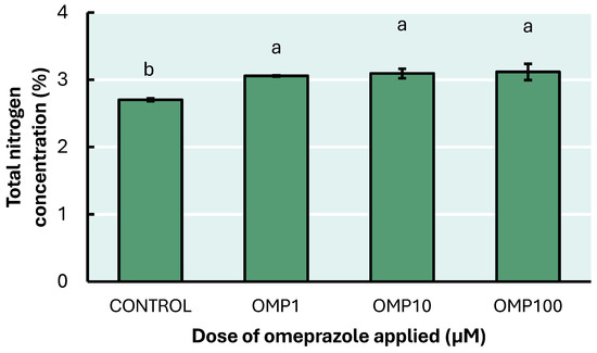 In our study, an increase in N concentration (p < 0.001) was observed as OMP was applied (Figure 4). However, the total N concentration was not statistically different between the 1, 10, and 100 µM doses. Finally, the 1 µM dose could be more effective by reducing the OMP dose 100 times and increasing the N concentration by 13%.