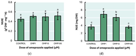 Effect of foliar OMP dose applied to green bean plants cv. Strike on (a) total nitrogen accumulated, (b) nitrogen uptake efficiency, (c) nitrogen utilization efficiency, and (d) nitrogen use efficiency index. Different letters for each graphic indicate significant statistical differences according to the LSD Fisher test (p ≤ 0.05).