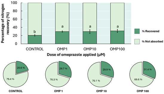 Effect of foliar OMP dose applied to green bean plants cv. Strike on nitrogen recovery percentage. Different letters indicate significant statistical differences according to the LSD Fisher test (p ≤ 0.05).