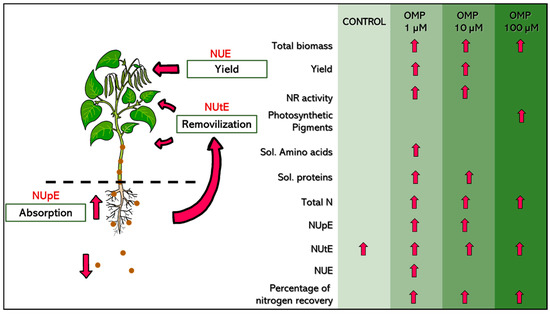Finally, total nitrogen concentration and nitrogen use efficiency parameters can be indicators of the mechanisms that favor high yield and plant biomass creation in bean plants [2]. Similarly, parameters which are commonly used to estimate the efficiency of fertilizers used for crop production are uptake efficiency (NUpE), utilization (NUtE), and nitrogen use efficiency (NUE) [37]. It is possible that the reason why there were no significant differences in the utilization coefficient (NUtE) is that all treatments were under optimal N nutrition, so their performance was normal. However, the highest coefficient of efficiency (NUE) was obtained with the lowest dose of OMP (1 µM) (Figure 5d). This result could indicate that the most favorable dose for agronomic, biochemical, and resource use efficiency parameters is the 1 µM dose.