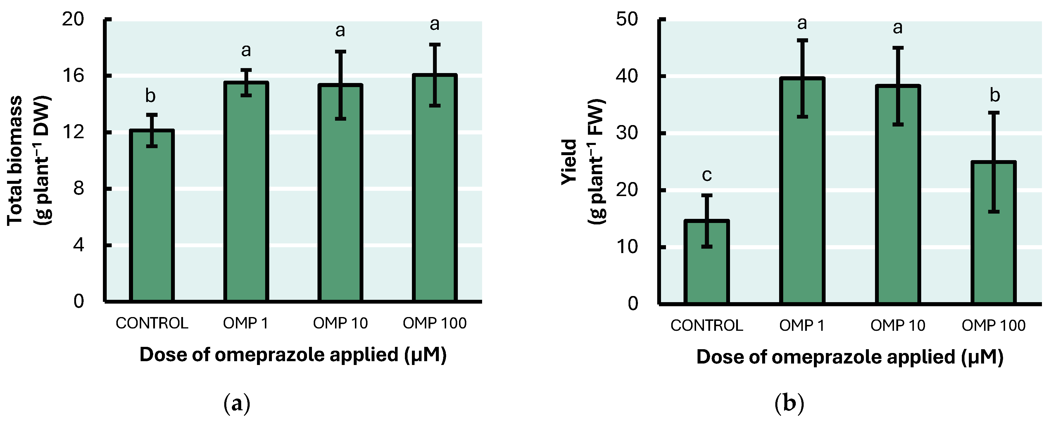 - Cirillo, V.; Van Oosten, M.J.; Izzo, M.; Maggio, A. Omeprazole treatment elicits contrasting responses to salt stress in two basil genotypes. Ann. Appl. Biol. 2019, 174, 329–338. [Google Scholar] [CrossRef]