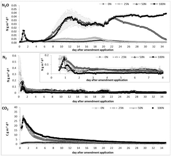 Carbon dioxide emissions increased immediately after amendment application (Figure 1), reaching maximum average fluxes of 27.5, 31.0, and 26.8 g C m−2 d−1 for 25N, 50N, and 100N treatments, respectively, after the first day of incubation. Fluxes decreased gradually over the course of the incubation, reaching values below 2 g C m−2 d−1 by the end of the experimental period. The 0N treatment showed fluxes between 0.9 and 1.9 g C m−2 d−1 during the 35 days of incubation.