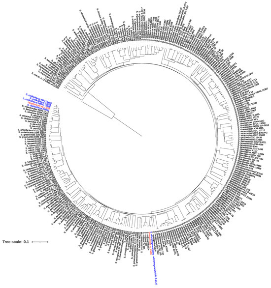 In order to conduct a comprehensive analysis of Streptomyces genomes, 1–4 genomes were downloaded for each species from the NCBI database (Table S1), resulting in a total of 307 genomes. Additionally, the genome of Escherichia coli str. K-12 substr. MG1655 (NC_000913.3) was downloaded as a reference outgroup for the phylogenetic tree. All statistical data (n = 308) were obtained using QUAST v.5.1.0rc1 [23]. Subsequently, a phylogenomic analysis was performed on 310 genome sequences, including the Streptomyces strains from this study, using the Virtual Analysis Method for Phylogenomic Fingerprint Estimation (VAMPhyRE v.2020; https://biomedbiotec.encb.ipn.mx/VAMPhyRE accessed on 5 January 2024), following the procedure described by Muñoz-Ramírez et al. [29]. Briefly, VAMPhyRE was used to determine Virtual Genome Fingerprints (VGF) from the bacterial genomes in our dataset, including both complete and draft forms. Virtual hybridization was conducted by identifying hybridization sites using a collection of 15,264 VAMPhyRE probes, each 13 nucleotides long (VPS-13), targeting both the positive (+) and negative (−) strands of the genomes, allowing for a single mismatch. Each genome’s VGF is constituted by the assemblage of hybridization sites. Genomic distances were calculated by comparing all pairs of VGF and determining the number of shared homologous sites, resulting in a distance matrix using the methodology described by Nei and Li [30]. To ensure that only homologous sites shared within the distance metrics were considered, an extending-match technique was employed, where seven bases at both ends of the sites were extended, and homologous sites were determined by a minimum criterion of 27 base matches. The phylogenomic tree was constructed using the Neighbor-Joining method with the software MEGA 11 [31], and further refined and annotated using iTOL v.3 [32].