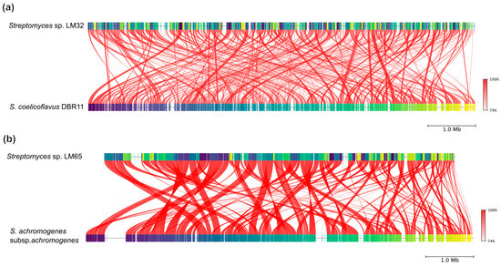 Detailed visualization of reciprocal mappings between two pairs of Streptomyces genomes calculated with FastANI. (a) Comparison between Streptomyces sp. strain LM32 and Streptomyces coelicoflavus DBR11. (b) Comparison between Streptomyces sp. strain LM65 and Streptomyces achromogenes subsp. achromogenes. The red lines denote conserved genomic regions with the color intensity indicating a high value of ANI.