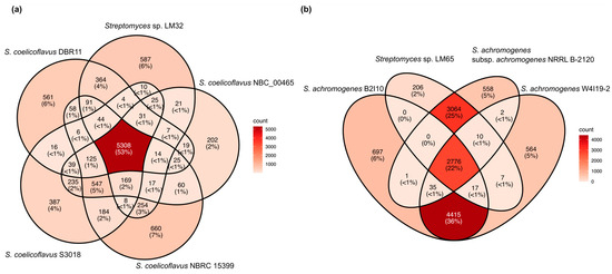 Comparative pan- and core-genome analysis of Streptomyces species. (a) Comparison between Streptomyces sp. strain LM32 and Streptomyces coelicoflavus. (b) Comparison between Streptomyces sp. strain LM65 and Streptomyces achromogenes. Each ellipse shows in sum the total number of genes of one strain. Intersections indicate predicted shared content. The color gradient represents the density of shared genes across the genomes.