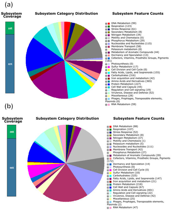 Pie charts showing an overview of RAST subsystems assigned to genes in (a) Streptomyces sp. strain LM32 and (b) Streptomyces sp. strain LM65.