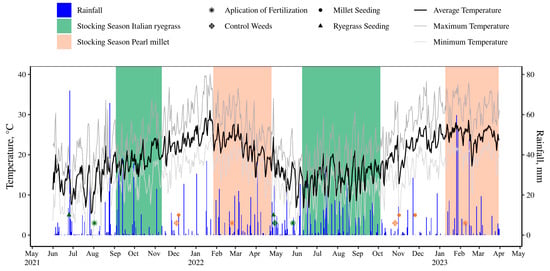 During both the winter seasons of 2021 and 2022, Italian ryegrass seeds were uniformly distributed at a rate of 30 kg ha−1. Following distribution, these seeds were promptly incorporated into the soil using a covering grid. Sowing took place on 25 June 2021 for the first season and on 27 April 2022 for the second season (Figure 1). In the summer season, pearl millet seeds were planted at a rate of 40 kg ha−1 using a row planter in a direct planting system. The initial sowing occurred on 6 December 2021. For the second year, the sowing was split into two occasions, on 1 November 2022 and 25 November 2022. In the first winter season, the soil preparation involved the use of a leveling harrow. Following this, in the subsequent winter, the area was simply mowed after sowing. Herbicides (Glyphosate and 2,4–D) were applied in the summer season before pearl millet sowing, consistently across both years. Both herbicides were applied at a rate of 2 L per hectare according to the manufacturer’s technical recommendations.
