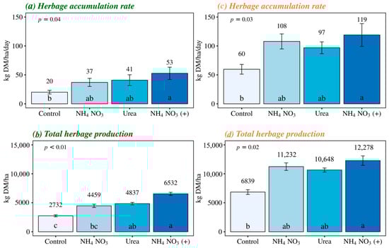 The effects of different nitrogen sources were similar in the herbage accumulation rate for both species evaluated in this study (Figure 2a,c). Fertilization with NH4NO3 (+) resulted in increases of 165% and 98% in the average accumulation rate of Italian ryegrass and pearl millet, respectively, compared to no fertilization (p < 0.05). On the other hand, there were no significant differences between the other nitrogen sources and the control treatment.