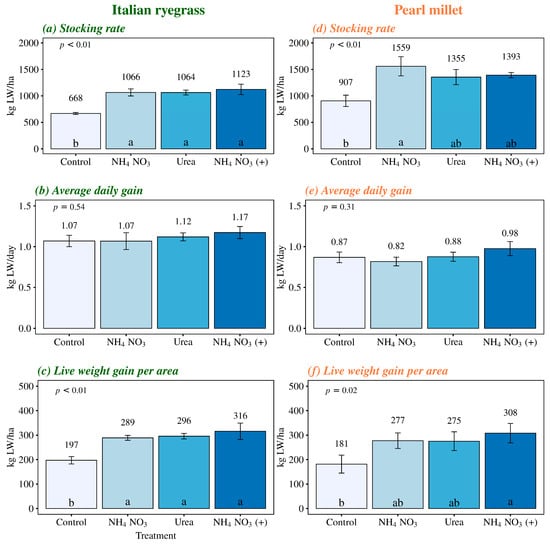 Stocking rate, average daily gain, and live weight gain per area in Italian ryegrass and pearl millet managed under different nitrogen fertilization sources. Control, with no application of N; NH4NO3, ammonium nitrate (32% N), Urea (46% N); and NH4NO3 (+), Ammonium nitrate with calcium and sulfur (27% N + 5% Ca + 3.7% S). The error bars represent the standard error of the mean. Different lowercase letters indicate significant differences between the treatments (p < 0.05).