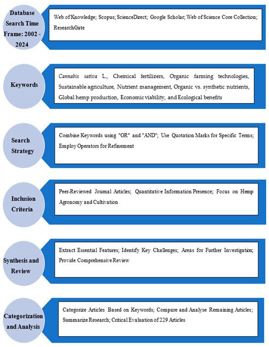 A thorough literature search was conducted across multiple academic databases, including Web of Knowledge, Scopus, ScienceDirect, Google Scholar, Web of Science Core Collection by Clarivate Analytics, and ResearchGate, focusing on publications up to 2024. We employed a diverse set of keywords to capture various aspects relevant to the cultivation of hemp and its response to different fertilization methods. These keywords included “hemp cultivation”, “chemical fertilizers”, “organic fertilizers”, “nutrient effects on hemp”, “organic cultivation technologies”, “hemp growth conditions”, “economic impact of hemp farming”, and “global hemp production trends”. To ensure a broad and relevant range of search results, keywords were combined using logical operators such as “OR” and “AND”. Including quotation marks around specific terms, such as “organic hemp cultivation”, helped in accurately retrieving pertinent records. All keywords were consistently used across all selected databases to maximize search coverage and gather a comprehensive collection of literature (Figure 2).