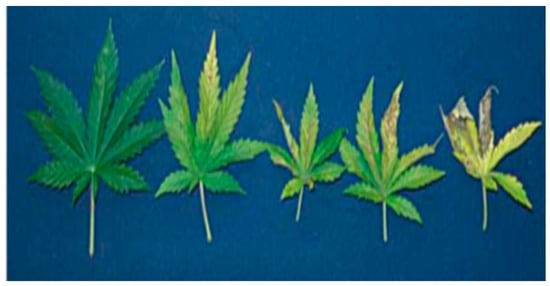The visual appearance of leaves of cannabis developed on plants receiving increasing K supply. From left to right: 15, 60, 100, 175, and 240 ppm K. Images of the youngest fully developed leaf on the main stem, taken 26 days after the initiation of the fertigation regime [151].