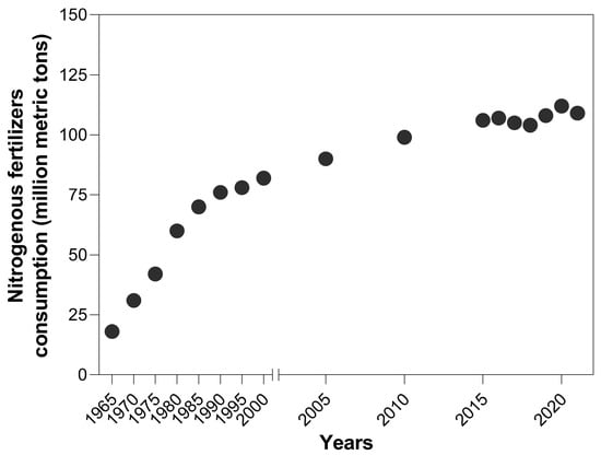 The global consumption of nitrogen fertilizers surged from 18.6 million metric tons in 1965 to 119.2 million tons in 2021, which marked an increase of approximately 540.86% (Figure 1). Asia led this increase, with East and South Asia consuming the most. In 2019, China used about 23 million metric tons of nitrogenous fertilizers [16]. This rise reflects the growing demand for higher agricultural productivity and can cause significant implications for nitrogen cycling and environmental health.