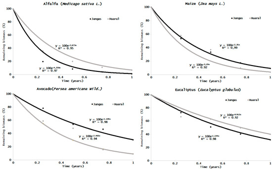 By the end of the study year, significant differences in the remaining biomass over time were observed for the four crops evaluated between the two locations. Alfalfa exhibited differences in remaining biomass from the outset, consistently maintaining these differences throughout the experiment, with Jangas showing lower remaining biomass. Significant differences emerged after six months for maize, with Huaral displaying a smaller remaining biomass. Both avocado and eucalyptus exhibited significant differences in remaining biomass, but only towards the end of the study.