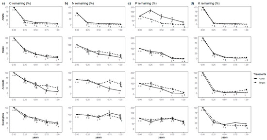 Regarding N, significant differences were observed between the different crops and evaluation times but not between the evaluated sites. However, an interaction between the crops and evaluated sites was present (Table 4). By the end of the study, all crops showed significant differences in remaining N between the two sites evaluated. However, the site with more significant remaining N varied by crop. In Jangas, maize and avocado retained more N, whereas, in Huaral, alfalfa and eucalyptus had higher remaining N, as illustrated in Figure 5b, tree crops either accumulated or maintained their N levels, unlike C and biomass, which steadily decreased. On the other hand, herbaceous crops, particularly alfalfa, experienced a substantial loss of initial N.