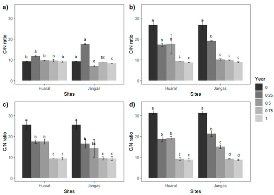 (a) Alfalfa C/N; (b) Maize C/N; (c) Avocado C/N; (d) Eucalyptus C/N ratio. Different letters (a,b,c,d) indicate significant differences.