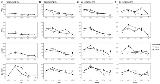 For avocado in Jangas, a large initial accumulation was followed by a decrease, reaching values similar to the initial ones by the end of this study. In Huaral, the Cd levels remained similar to the initial ones until the last part of the year, when the remaining Cd reached 46%, indicating a more significant release than in Jangas. Eucalyptus showed an initial accumulation in both locations, which lasted up to mid-year in Jangas before falling and then rising again at the end of the study, with significantly greater accumulation in Huaral.