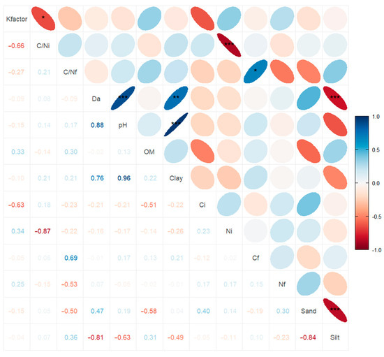 Spearman’s correlation analysis reveals positive and negative relationships among certain variables (Figure 8). The evaluated soil parameters do not exhibit a significant relationship with the k factor. However, significant correlations are observed among the soil parameters themselves, including inverse relationships between silt, sand, and bulk density. Clay also shows a direct relationship with pH and bulk density, while bulk density is also directly related to pH.