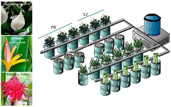 Some studies have demonstrated the phytoremediation potential of typical natural wetland plants in TWs [10,17]. However, in recent decades, the plants used in TWs have comprised ornamental vegetation because they possess several benefits, such as their aesthetic appearance, biodiversity enhancement, commercial value, and the removal of contaminants to avoid health problems. One study on the use of ornamental plants (Canna hybrids, Anturium spp.) for rural wastewater with TWs showed removal rates of 88%, 82%, and 52% for COD, phosphorus, and TN with Canna hybrids. When using Anturium spp., the removal rates were 87%, 84%, and 50% [12]. Another study compared the use of ornamental plants from tropical regions (Canna hybrid, Alpinia purpurata, and Hedychium coronarium) in TWs for wastewater treatment, detecting the removal of 63%, 78%, and 60% of nitrogen for each species, respectively. For phosphorous, the removal rates were 78%, 69%, and 68%, respectively [14]. Such studies have highlighted the effectiveness of the use of ornamental plants for wastewater treatment. However, knowing that the removal effect or behavior is dependent on the species, it is important to evaluate new species of ornamental plants in improving water quality and for the other benefits mentioned.