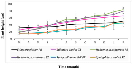 Figure 2 illustrates the changes in the heights of individual plants. H. psittacorum exhibited greater growth compared to the other species in both types of filter media. Its maximum heights were 80 cm and 84 cm in the PR and TZ filters, respectively, with a growth of almost 1 m during the study period. E. elatior showed smaller height increments than H. psittacorum in both filters, reaching maximum heights of 51 cm and 66 cm in the PR and TZ substrates, respectively, almost tripling in size during the study period. On the other hand, the S. wallisii plants only grew 30–35 cm in both filter media. Overall, the adaptation of plants to TW conditions was positive, indicating that the wetland conditions did not negatively impact their survival.