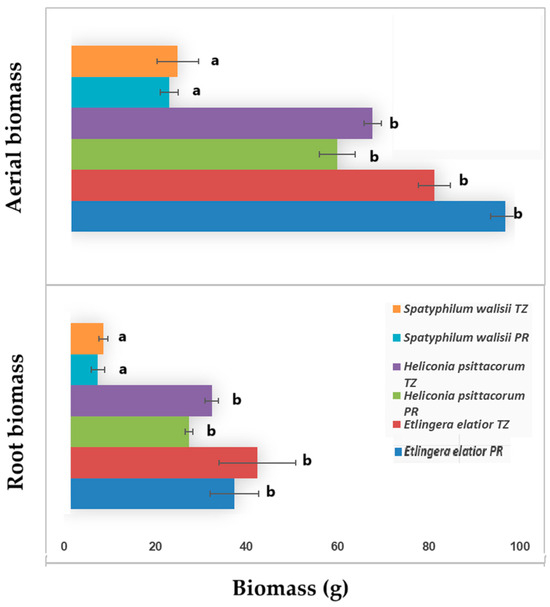Effect of substrate media and plants on the biomass production of different ornamental vegetation. Values are average ± standard error. Different letters indicate significant differences (p < 0.05).