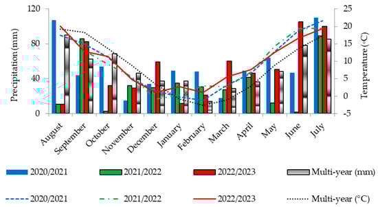 The seeds were treated with Scenic Gold (fluopicolide, fluoxastrobin) at a rate of 1 L/100 kg of seeds. Sowing was carried out on 20 August 2020, 19 August 2021, and 25 August 2022. The recommended sowing density for the cultivar LG Absolut is 40 seeds/m2. Plant protection products were applied according to the pesticide manufacturer’s recommendations following the prior monitoring of the plantation. All chemical applications were carried out using a tractor-mounted sprayer, with a liquid volume ranging from 200 to 300 L ha−1.