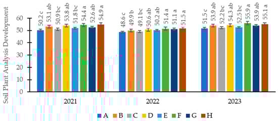 Soil–Plant analysis development (SPAD). A—nitrogen (150 kg ha−1)–control, B—nitrogen (200 kg ha−1), C—nitrogen + sulphur (150 kg ha−1 + 20 kg ha−1), D—nitrogen + sulphur (200 kg ha−1 + 20 kg ha−1), E—nitrogen + sulphur (150 kg ha−1 + 40 kg ha−1), F–nitrogen + sulphur (200 kg ha−1 + 40 kg ha−1), G—nitrogen + sulphur (150 kg ha−1 + 60 kg ha−1), H—nitrogen + sulphur (200 kg ha−1 + 60 kg ha−1).