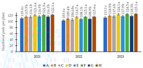 Number of pods per plant. A—nitrogen (150 kg ha−1)–control, B—nitrogen (200 kg ha−1), C—nitrogen + sulphur (150 kg ha−1 + 20 kg ha−1), D—nitrogen + sulphur (200 kg ha−1 + 20 kg ha−1), E—nitrogen + sulphur (150 kg ha−1 + 40 kg ha−1), F—nitrogen + sulphur (200 kg ha−1 + 40 kg ha−1), G—nitrogen + sulphur (150 kg ha−1 + 60 kg ha−1), H—nitrogen + sulphur (200 kg ha−1 + 60 kg ha−1).